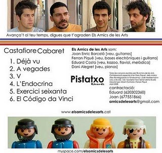 Són un grup musical que fa relativament poc que sonen amb força, però quan he posat el seu disc Castafiore Cabaret al CD del cotxe i he començar a escoltar-los, m’han recordat als inicis dels Gossos. A mida que anaven sonant les cançons m’han recordat les millors cúmbies de Dusminget i posteriorment a la Troba Kung-fú. Les lletres són divertides, fresques i descarades. Parlen del quotidià, del que passa ara i aquí i (suposo) que el què busquen és la diversió, el fer ballar i fer somriur a la gent. De debò, no us perdeu la oportunitat de descobrir-los si és que encara no ho heu fet.