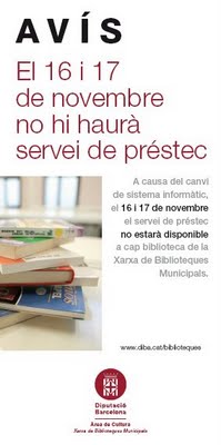 Avui i demà (16 i 17 de novembre) les biblioteques de la Xarxa de la Diputació de Barcelona NO PODREM FER PRÉSTECS, DEVOLUCIONS NI RENOVACIONS.
